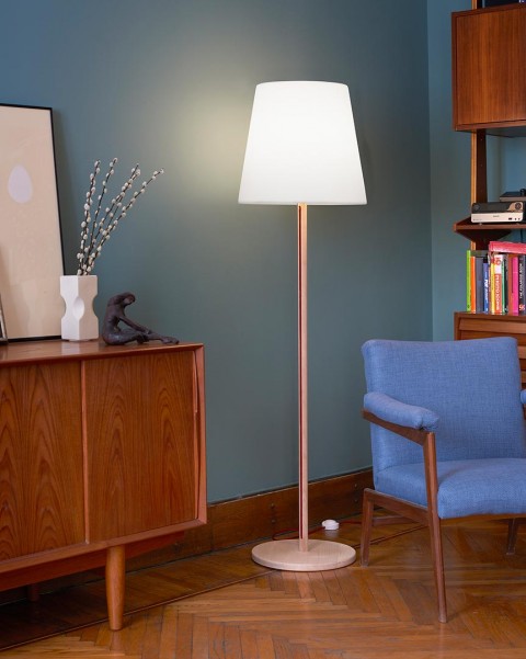 Elegancka lampa podłogowa wykona została z drewna bukowego i polietylenu.