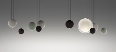 Kolekcja Cosmos składa się z lamp wiszących, spłaszczonych form o różnych rozmiarach, które tworzą iluzję optyczną wiszących kul wydających się unosić w powietrzu. Dostępna w różnych kolorach: ciemnobrązowym, zielonym i jasnoszarym.