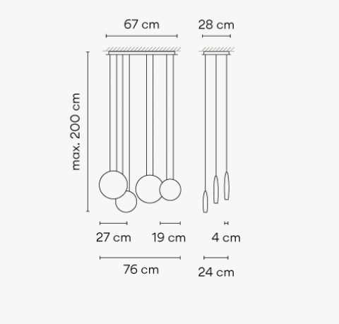 Kolekcja Cosmos składa się z lamp wiszących, spłaszczonych form o różnych rozmiarach, które tworzą iluzję optyczną wiszących kul wydających się unosić w powietrzu.
