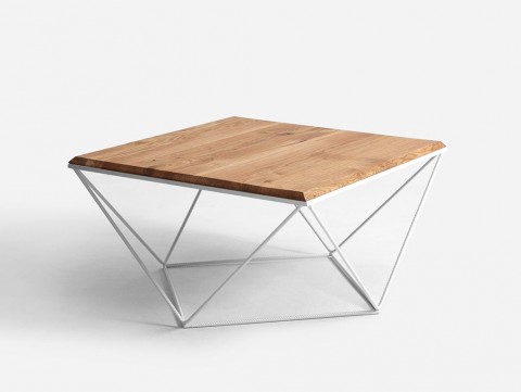 Ciekawy stolik kawowy posiada blat z litego drewna.