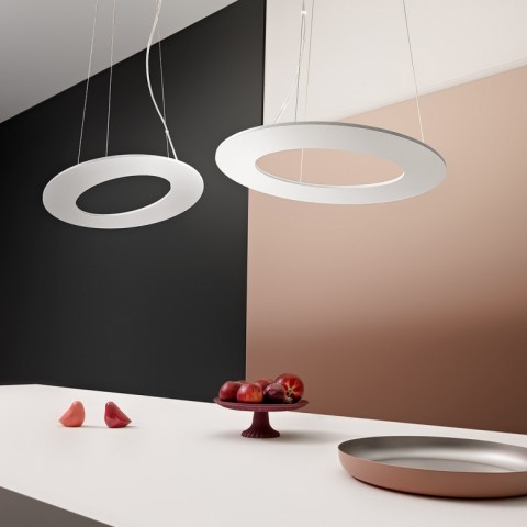 Klosz lampy wiszącej ma kształt owalnego pierścienia.