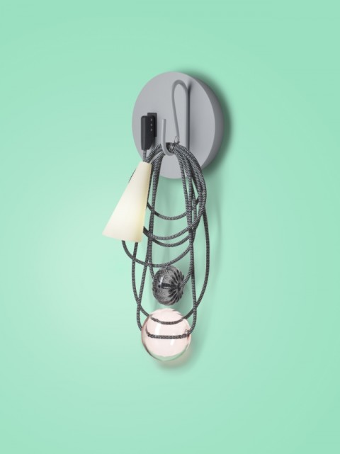 Na metalowy stelaż została założony zwinięty sznur, ozdobiony dwoma koralikami, zakończony niewielkim kloszem.