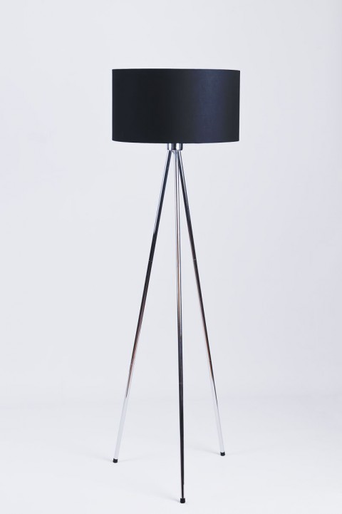 Lampa podłogowa składa się z okrągłego klosza i trójnożnego stelaża.