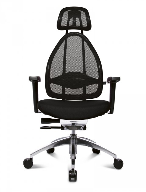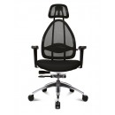 - Oparcie pokryte siatką, trójwymiarowo ruchome, z podparciem lędźwiowym z regulacją wysokości