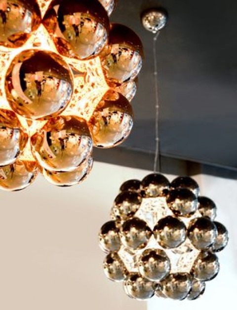 Lampa wisząca projektu Winnie Lui Wyglada jakby wykonana została z perełek opartych na pięciokątnym kształcie.