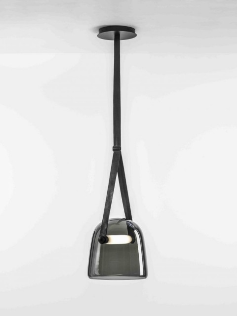 Lampa wisząca o futurystycznym kształcie dzwonu pokazuje piękno gładkiego szkła i subtelnych krzywizn klosza. Styl projektanta, Lucie Koldova, odzwierciedla kombinacja szkła, drewna i materiału.