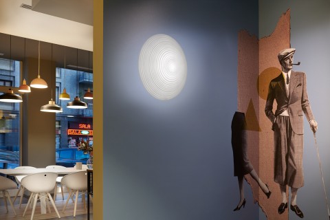 Owalna lampa o prążkowane strukturze zapewnia miękkie i ciepłe światło.