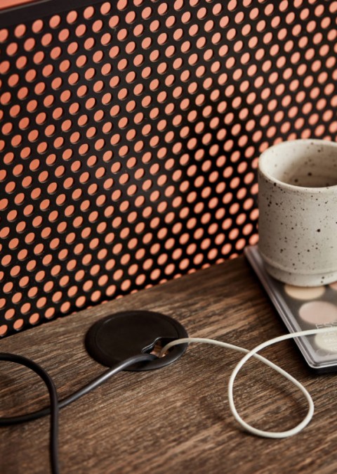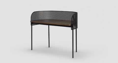 Blat biurka otoczony jest perforowaną stalą, tworząc lekkie odgrodzenie od zewnątrz, które owija się z przodu i po bokach. Sam blat wykonany jest z dymionej okleiny dębowej. Konstrukcja wykonana jest ze stali.