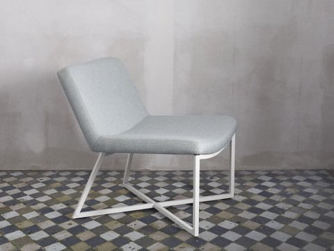 Nieduży fotel z metalowymi białymi nogami sprawdzi się w nowoczesnym wnętrzu.
